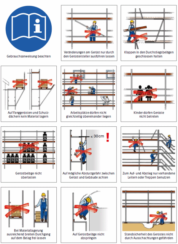 Kontrollieren Sie die Gerüste vor deren Nutzung auf Betriebssicherheit, z. B. Absturzgefährdungen. Lassen Sie Gerüste nicht verwenden, wenn eine Absturzgefahr besteht.