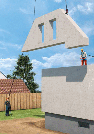 Die Montage von Fertigteilen, egal ob sie aus Beton, Holz bzw. Holzwerkstoffen oder Mauerwerk bestehen, setzt eine sorgfältige Planung und Organisation für den reibungslosen und sicheren Ablauf der Arbeiten voraus. Eine wesentliche Rolle spielt dabei die Gestaltung der Hebe- und Transportvorgänge auf den Baustellen sowie die Sicherung von Personen gegen Absturz.