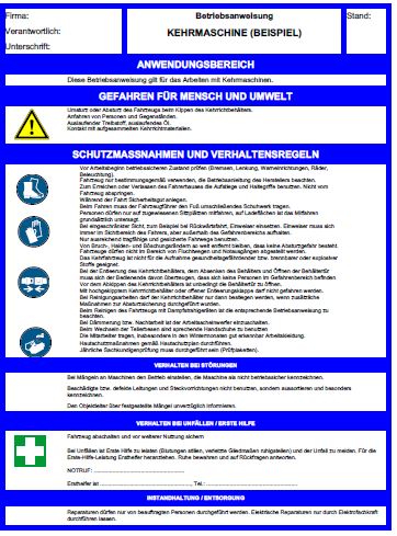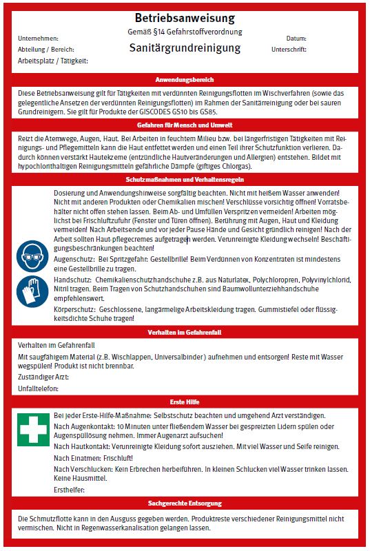 Bei Kontakt mit Reinigungs- und Pflegemitteln müssen Schutzhandschuhe getragen werden, jedoch keine Einmalhandschuhe aus Latex. Nach der Arbeit und vor den Pausen sollten die Hände gewaschen und Hautpflegemittel aufgetragen werden. Betriebsanweisungen Es ist nicht notwendig, für jedes einzelne Produkt eine eigenständige Betriebsanweisung zu erstellen. Mit dem "GISCODE" werden Reinigungs- und Pflegemittel zu Produktgruppen zusammengefasst, die vergleichbare Gefährdungen aufweisen und demzufolge identische Schutzmaßnahmen und Verhaltensregeln erfordern. Dadurch können Sie die Vielzahl einzelner Produkt-Betriebsanweisungen auf wenige Produktgruppen-Betriebsanweisungen reduzieren. Die Hersteller geben den GISCODE in ihren Sicherheitsdatenblättern, Technischen Merkblättern und auf den Gebindeetiketten an. ![]() Abb. 10 Betriebsanweisung Unterweisung Grundlage der Unterweisung ist die Betriebsanweisung. Beschäftigungsbeschränkungen Schwangere oder stillende Frauen dürfen keine Tätigkeiten mit Gefahrstoffen ausüben, die für sie oder ihr Kind eine unverantwortbare Gefährdung darstellen. Eine unverantwortbare Gefährdung liegt beispielsweise bei schwangeren Frauen vor, wenn Tätigkeiten mit fruchtschädigenden Gefahrstoffen ausgeübt werden oder wenn bei einer Tätigkeit der Arbeitsplatzgrenzwert überschritten wird. Maßnahmen bei Feuchtarbeit Bei Feuchtarbeit oder beim Tragen flüssigkeitsdichter Handschuhe von regelmäßig mehr als zwei Stunden bis vier Stunden je Tag ist arbeitsmedizinische Vorsorge anzubieten. Bei Feuchtarbeit oder beim Tragen flüssigkeitsdichter Handschuhe von regelmäßig vier Stunden oder mehr je Tag ist arbeitsmedizinische Vorsorge zu veranlassen. Maßnahmen gegen Gefährdungen durch Stäube bzw. Aerosole Einsatz von