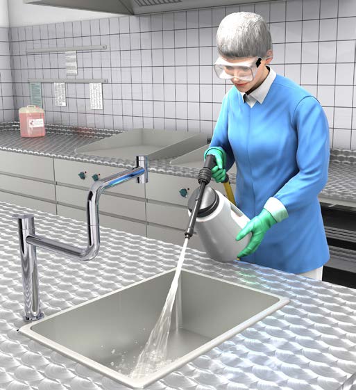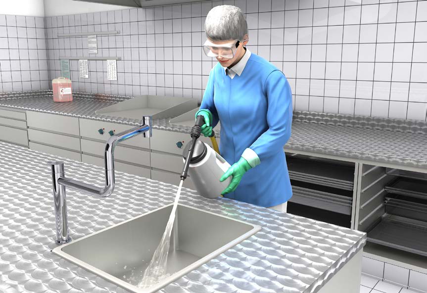 ![]() Abb. 9 Umfüllen von Konzentraten Reinigungs- und Pflegemittel dürfen in der Regel nicht gemischt werden. Das gilt auch für die Entsorgung von Restmengen. Beim Ansetzen der Reinigungsflotte ist grundsätzlich kaltes Wasser zu verwenden, um das verstärkte Auftreten von Dämpfen zu vermeiden. Das Reinigungsmittel sollte dem Wasser zugegeben werden, nicht umgekehrt. Überdosierungen sind zu vermeiden und Dosiersysteme (z. B. Dosierflaschen, Dosieranlagen) sollten benutzt werden. Gegebenenfalls sollte Atemschutz verwendet werden.