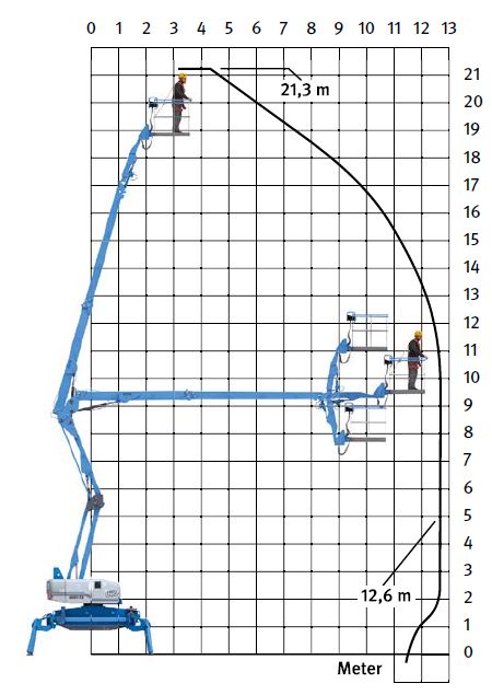 Berücksichtigen Sie im Rahmen der Gefährdungsbeurteilung insbesondere die Hubarbeitsbühne selbst, die Arbeitsumgebung, die Arbeitsabläufe sowie die Eignung der Bedienenden. Ergibt sich nach der Gefährdungsbeurteilung das Risiko des Herausfallens aus dem Arbeitskorb (z. B. Peitscheneffekt), so sind nur Hubarbeitsbühnen mit geeigneten Anschlagpunkten für PSAgA einzusetzen. Ein kurzes Anschlagen ist erforderlich (max. Verbindungsmittellänge 1,8 m einschl. Falldämpfer), es kann beispielsweise mit einem Höhensicherungsgerät erfolgen, das speziell für die Verwendung zugelassen ist. Sorgen Sie dafür, dass die Beschäftigten in der Nutzung der PSAgA unterwiesen sind und diese benutzen. ![]() Abb. 43 Einsatz von PSA gegen Absturz in der Hubarbeitsbühne mit zugelassenem Anschlagpunkt Organisieren Sie das Rettungskonzept. Technik Setzen Sie nur geeignete, unterwiesene, befähigte und schriftlich beauftragte Beschäftigte für das Bedienen ein. Zur Beurteilung der Befähigung kann ein Schulungsnachweis hilfreich sein. Organisieren Sie eine gerätebezogene Einweisung der Bedienerinnen und Bediener. Unterweisen Sie mindestens einmal jährlich diese anhand einer Betriebsanweisung bzw. der Betriebsanleitung über den sicheren Umgang mit der Hubarbeitsbühne. Üben Sie mit den Bedienenden regelmäßig den Notablass. Stellen Sie sicher, dass die von den Herstellern der Hubarbeitsbühnen getroffenen Festlegungen zur bestimmungsgemäßen Verwendung eingehalten werden. Gewährleisten Sie durch regelmäßige oder falls erforderlich anlassbezogene Prüfungen den sicherheitstechnischen Zustand Ihrer Hubarbeitsbühnen und dokumentieren Sie diese. Sorgen Sie bei gegenseitigen Gefährdungen mit anderen Beschäftigten für eine ausreichende Koordination und treffen Sie geeignete Sicherungsmaßnahmen. ![]() Abb. 44 Diagramm Reichweite/Arbeitshöhe einer Teleskopbühne Verhalten beim Betrieb Verfahren Sie Hubarbeitsbühnen insbesondere bei hochgefahrenem Arbeitskorb nur auf ebenem Grund. Sichern Sie erforderlichenfalls Bodenöffnungen und Vertiefungen im Fahrbereich. Beim Verfahren der Hubarbeitsbühne sind durch die bedienende Person ständig alle Bewegungen des Auslegers zu beobachten. Weisen Sie Ihre Beschäftigten darauf hin, ausreichend Abstand zu Hindernissen wie Freileitungen, Kanten und Böschungen einzuhalten.