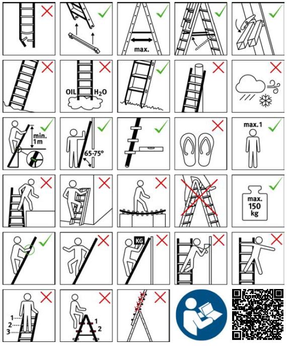 Bei Sprossenanlegeleitern sollte der Aufstellwinkel zwischen 65 und 75 Grad betragen. Bei Stufenanlegeleitern soll der Anstellwinkel zwischen 60 und 70 Grad betragen: Gewährleisten Sie, dass durch Arbeiten auf der Leiter das Kippmoment durch seitliches Hinauslehnen nicht überschritten wird. ![]() Abb. 50 Anstellwinkel der Glasreinigerleiter Stehleitern dürfen nicht für das Übersteigen auf hochgelegene Arbeitsplätze oder als Anlegeleitern verwendet werden. Sorgen Sie dafür, dass bei aufgesetzten Schiebeleitern die obersten vier, bei Anlegeleitern die obersten drei und bei Stehleitern die obersten zwei Stufen nicht betreten werden. Beim Einsatz von Schiebeleitern, Mehrzweckleitern oder Steckleitern sind die Leiterteile unbeweglich miteinander zu verbinden. Prüfung Leitern sind vor der Verwendung durch die Benutzerin und den Benutzer auf ordnungsgemäßen Zustand zu überprüfen. Stellen Sie sicher, dass defekte Leitern nicht verwendet werden. Mängel sind Vorgesetzten zu melden. Alle festgelegten Maßnahmen sind in einer Gefährdungsbeurteilung zu dokumentieren. |