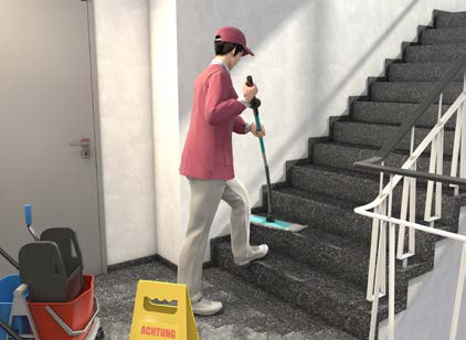 Die erforderlichen Schutzmaßnahmen ergeben sich aus den örtlichen Gegebenheiten und dem eingesetzten Personal. ![]() Abb. 52 Müll sammeln Elektrische Gefährdung Stolpern, Rutschen, Stürzen ![]() Abb. 53 Treppenreinigung Umgang mit Reinigungsmitteln und Feuchtarbeit Das Tragen von Atemschutz ist bei der Unterhaltsreinigung nicht erforderlich. Nach der Arbeit oder bei längeren Unterbrechungen sollten die Hände mit hautpflegenden Salben eingecremt werden. Bei Reinigungsarbeiten mit Unterhaltsreinigern ist eine Betriebsanweisung zu erstellen, die im Wesentlichen auf die Hautgefährdung abgestimmt ist. |