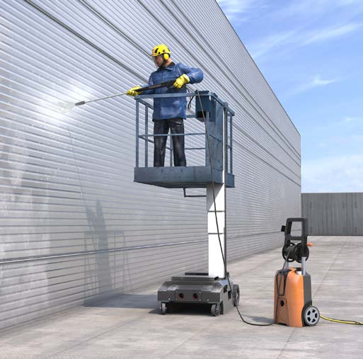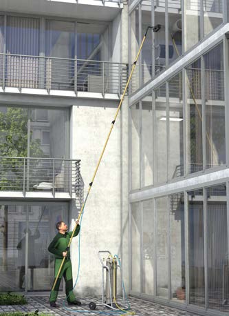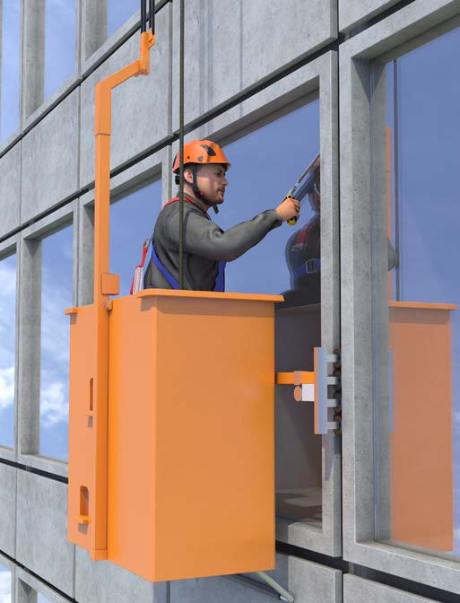 ![]() Abb. 62 Fassadenreinigung mit Fassadenbefahranlage Sorgen Sie dafür, dass der Bereich unterhalb von hochgelegenen Arbeitsplätzen gesichert ist. Verkehrsgefährdungen
