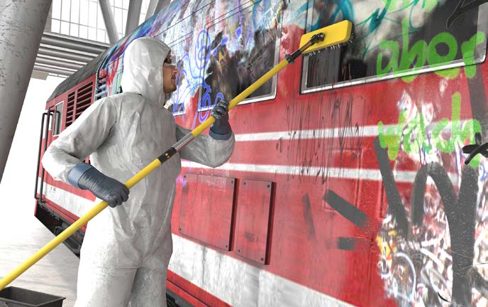 Gefahrstoffe (Einsatz von Reinigungsmitteln, Graffitientfernung) Berücksichtigen Sie bei der Festlegung geeigneter Schutzmaßnahmen das angewendete Arbeitsverfahren (z. B. Sprühen) sowie die Arbeitsumgebung und -bedingungen, z. B. Lüftungsverhältnisse oder Überkopfarbeiten. Erstellen Sie hierüber eine Betriebsanweisung. ![]() Abb. 78 Graffitientfernung auf dem Betriebshof Angefahren und Überfahren werden durch Betriebsverkehr Stoßen, Schneid- und Stichverletzungen Biostoffe Je nach Einzelfall sind zusätzliche Vorkehrungen zum Schutz der betroffenen Beschäftigten zu treffen. |