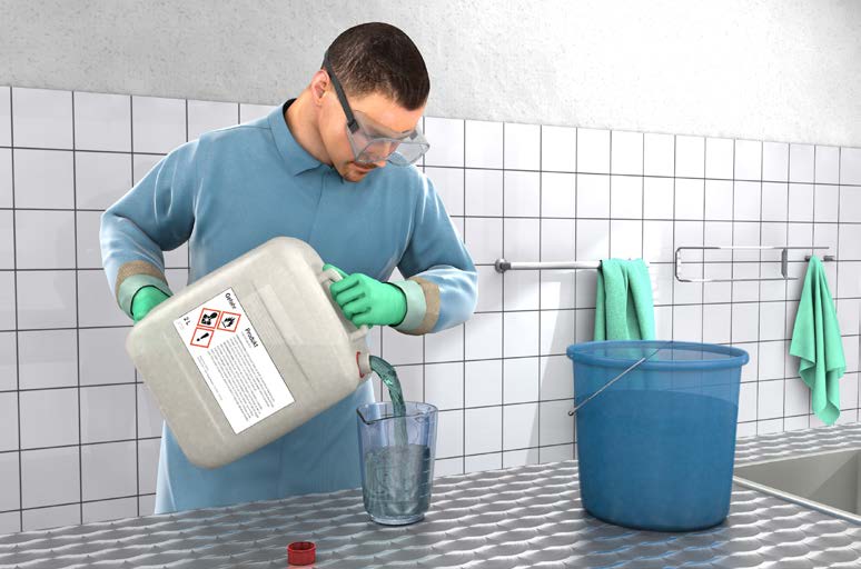 Bei der Gebäudereinigung können Ihre Beschäftigten durch den Einsatz von Reinigungs-, Desinfektions- und Pflegemitteln oder durch Tätigkeiten, bei denen Stäube bzw. Aerosole freigesetzt werden, in Kontakt mit Gefahrstoffen kommen. Die Gefahr für Sicherheit und Gesundheit können Sie am effektivsten durch die Verwendung unbedenklicherer Arbeitsstoffe oder Arbeitsverfahren reduzieren oder sogar vermeiden.