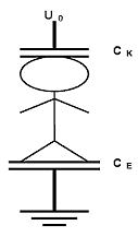 Für inhomogene Felder ist ein Verfahren zulässig, das durch Vergleich des Gesamtkörperableitstroms in einem homogenen elektrischen Feld eine Beurteilung der Exposition in stark inhomogenen Feldern zuläßt. Der Gesamtkörperableitstrom ist der Körperstrom, der durch Influenzwirkung auf eine im elektrischen Wechselfeld befindliche Person zwischen deren Füßen und der Bodenfläche auftritt. Die Kapazität CE (siehe Abb. 1) wird über ein Strommessgerät praktisch kurzgeschlossen, so dass der influenzierte Strom durch den Messpfad fließt (siehe Abb. 2). Die Person muß hierzu gut isoliert vom Erdboden stehen, damit der Strompfad über die Füße vernachlässigt werden kann. Der Gesamtkörperableitstrom ist ein Maß für die mittlere Feldstärke, in der sich eine Person aufhält. Aus ihm kann die Ersatzfeldstärke des äquivalenten homogenen Feldes berechnet werden.