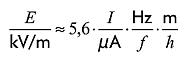 Um die Ableitströme in eine äquivalente homogene Feldstärke umrechnen zu können, muß der Gesamtkörperableitstrom I von den Personen, mit denen die Messungen vorgenommen werden, in einem bekannten bzw. vermessenen homogenen Feld E, z.B. dem unter der Sammelschiene einer Umspannanlage oder eines Prüffeldes, ermittelt werden. Aus der Messung wird dann für jede Person der jeweilige körperbezogene Faktor k=E/I bestimmt. An den entsprechenden Arbeitsstellen mit inhomogenem elektrischen Feld wird dann aus diesem körperbezogenen Faktor k und dem gemessenen Gesamtkörperableitstrom I die Ersatzfeldstärke des äquivalenten homogenen Feldes Ee bestimmt: