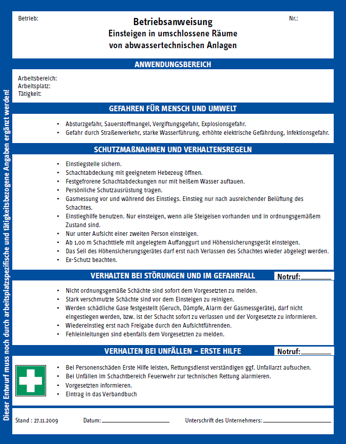 - Ein Alarm- und Rettungsplan muss vorhanden sein.