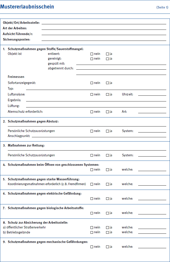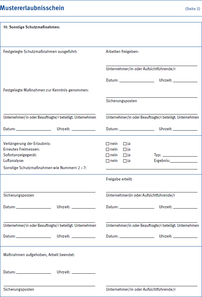 - Beurteilung, ob noch weitere Maßnahmen auf Grund besonderer Gefahren notwendig sind (ggf. Erlaubnisschein erstellen).