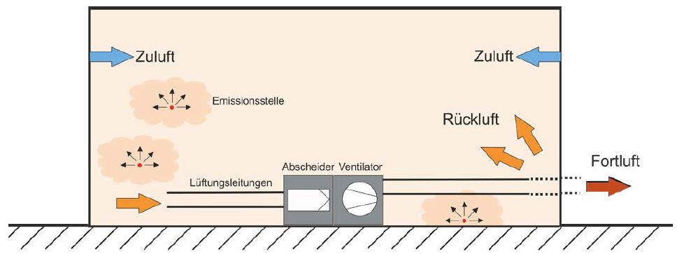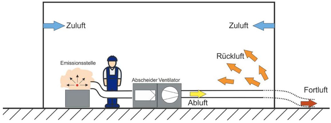 Bei beiden Varianten ist darauf zu achten, dass Emissionen möglichst aus dem Atembereich der Beschäftigten weggeführt werden und unbelastete Luft zugeführt wird. Fortluftbetrieb ist zu bevorzugen. Für ausreichende Nachströmung von Außenluft ist durch geeignete Zuluftöffnungen (z. B. luftdurchlässige Staubschutztür, Filtervlies im Fenster) zu sorgen.