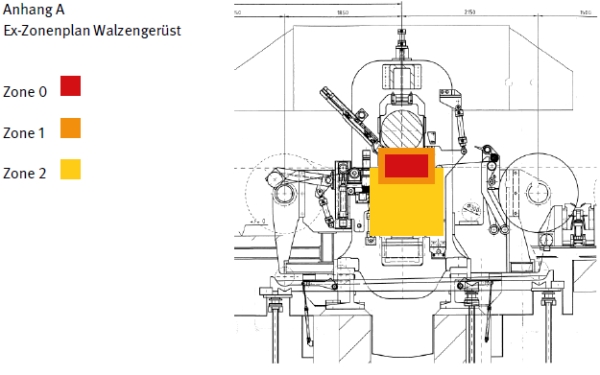 | Gefährliche explosionsfähige Atmosphäre (g.e.A.) kann auftreten: Normalbetrieb: Im Nahbereich des Walzenspaltes wird durch Eindüsen von Petroleum eine g.e.A. durch das Aerosol/Dampf/Luft-Gemisch erzeugt (Vol. = ca. 300 Liter). Durch starke Konvektion in diesem Bereich, eine Objektabsaugung oberhalb des Walzengerüstes und dem niedrigen Dampfdruck des Petroleums kommt es zur starken Verdünnung in den angrenzenden Bereichen. Die maximale Temperatur am Walzenspalt beträgt ca. 150 °C, somit beträgt der Abstand zur Zündtemperatur ca. 60 °C (80 % der Zündtemp.= 168 °C). Andere Zündquellen in diesem Bereich sind u.a. das Rollenlager. Technische Störung: Durch Folienabriss (Materialstau) oder Lagerüberhitzung können sich im Bereich des Walzenspaltes wirksame Zündquellen bilden. Da das Petroleum auch bei einer Störung weiter in diesen Bereich eindüst, kann es zur Zündung der g.e.A. kommen. Durch die mit Petroleum benetzten Oberflächen ist eine schnelle Brandausbreitung gegeben. |