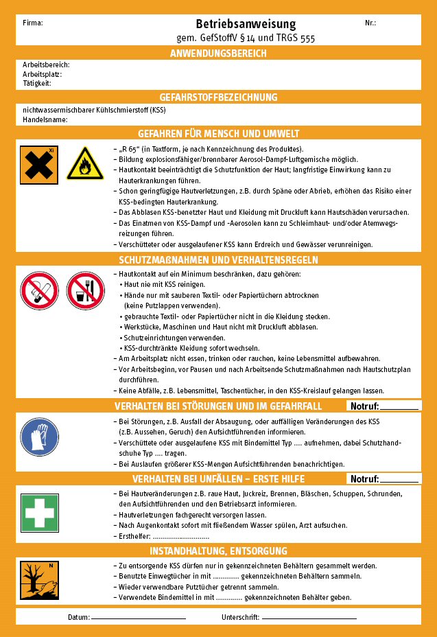 Muster einer Betriebsanweisung für nichtwassermischbare Kühlschmierstoffe