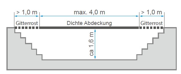 - bei nicht abgedeckten Arbeitsgruben in Bauwerken, wenn das Verhältnis der Länge ihrer Arbeitsöffnungen zu ihrer Tiefe mindestens 3:1 und ihre Tiefe bis ca. 1,6 m beträgt; bei der Bemessung der Tiefe bleiben Bodenroste unberücksichtigt,