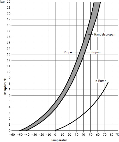 Diagramm 1 Dampfdruckdiagramm für Propan und n-Butan in Abhängigkeit von der Temperatur (Überdruck)