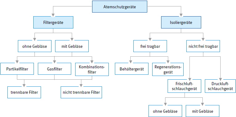 Atemschutzgeräte werden entsprechend ihrer Wirkungsweise in Filtergeräte (filtrierend, abhängig von der Umgebungsatmosphäre wirkend) und Isoliergeräte (atemgasliefernd, unabhängig von der Umgebungsatmosphäre wirkend) unterteilt sowie nach ihrer Bauform und Funktionsweise unterschieden.