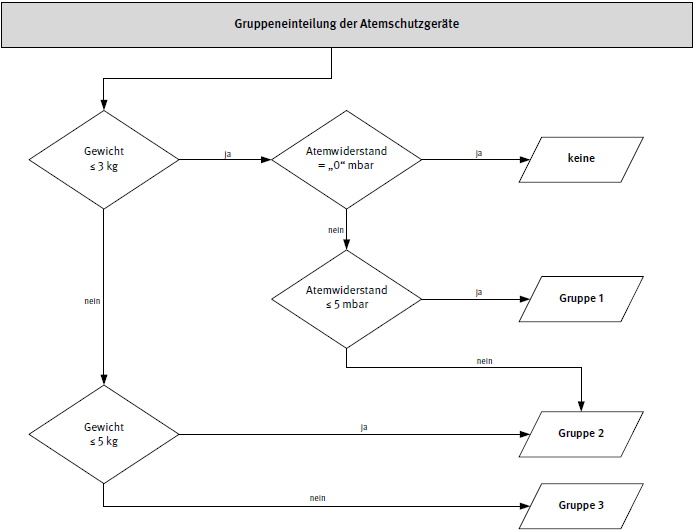 Die Gruppeneinteilung der Atemschutzgeräte erfolgt nach dem Gerätegewicht und den Druckdifferenzen bei der Einatmung sowie der Ausatmung (Einatemwiderstand, Ausatemwiderstand). Für die Zuordnung des Atemschutzgerätes zu einer Gruppe ist die Überschreitung bereits eines der beiden Grenzwerte (Gerätegewicht oder Atemwiderstand) maßgebend. Die Belastung durch die Geräte steigt von Gruppe 1 nach Gruppe 3 an.