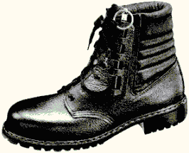 Ein anderer Schnellverschluss besteht aus einer scharnierartig angebrachten Lederlasche. Er wird durch das Ziehen eines biegsamen Drahtseilstabes am oben angebrachten Ring geöffnet. Bei geschlossener Verbindung wird der Stiefel normal geschnürt (siehe Bild 9).