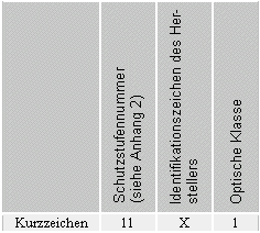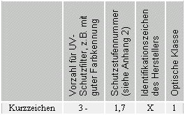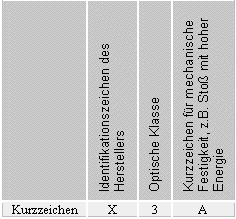 Die optische Klasse nach DIN EN 166 wird – durch Schrägstriche getrennt – um die Streulichtklasse und die Homogenitätsklasse nach DIN EN 379 ergänzt; hier z.B. 1/3/2. |