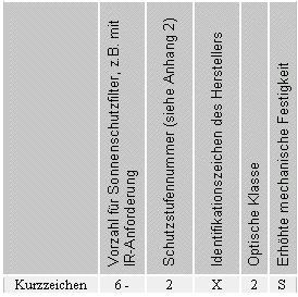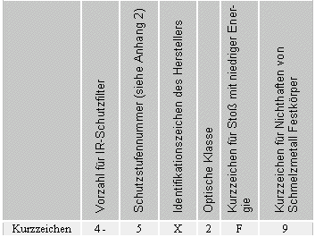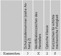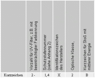 Zusätzlich sind gegebenenfalls die Zeichen für die Erfüllung von Zusatzanforderungen nach DIN EN 166 anzubringen. |
