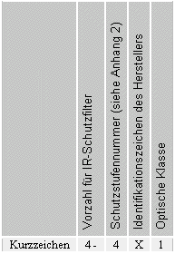 An die Stelle der Schutzstufennummer treten die Schutzstufennummern der Hell- und Dunkelstufe, getrennt durch einen Schrägstrich. Ist der Dunkelzustand von Hand einstellbar, sind die Grenzen des erreichbaren Schutzstufenbereiches mit Bindestrich getrennt zu kennzeichnen. |