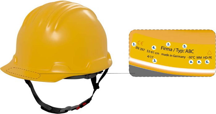 Kopfschutz muss so gekennzeichnet sein, dass die nach der jeweiligen Norm geforderten Angaben deutlich sichtbar angebracht werden und während der Lebensdauer des Kopfschutzes lesbar bleiben. Diese dauerhafte Kennzeichnung kann beispielsweise in Form einer geprägten, einer gegossenen oder einer unverlierbar angebrachten Kennzeichnung erfolgen. Die aufgrund der jeweilig umgesetzten Norm erforderlichen Zusatzinformationen sind in Form eines Etiketts beziehungsweise eines Schildes anzubringen.