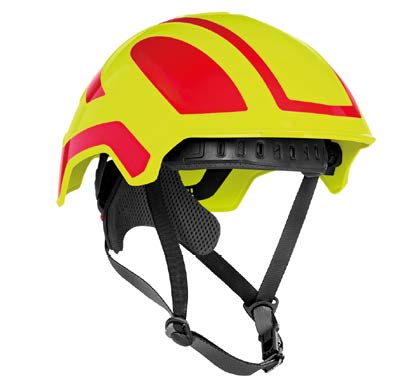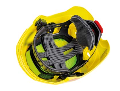 Die Befestigung des Kinnriemens erfolgt an vier Punkten des Helms und eignet sich ebenfalls bei einer möglichen Absturzgefährdung.