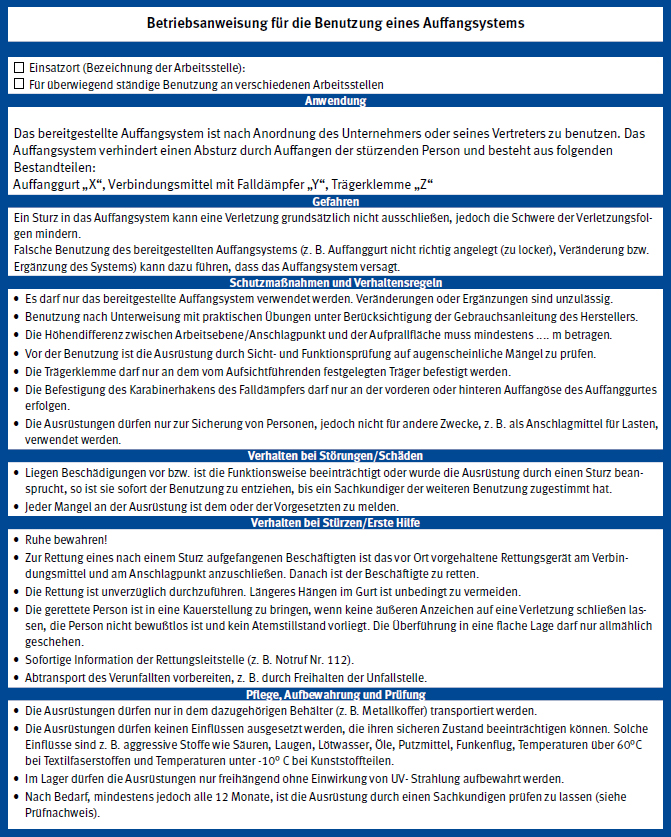 Muster einer Betriebsanweisung für ein Auffangsystem