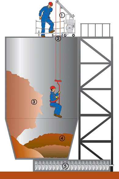 ![]() Abb. 14 Mögliche Gefährdungen bei Arbeiten in einem Silo (beispielhaft) |