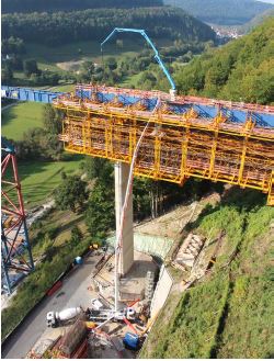 Abb. 1 Brückenbaustelle mit Betonpumpeneinsatz und Frischbetonversorgung durch Fahrmischer