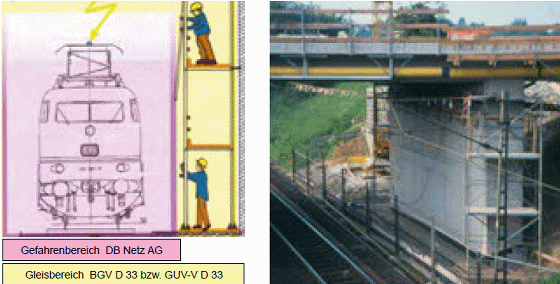 | Abb. 1-1: | Beispiel zum Gleisbereich: Beim Hantieren mit Gerüstrohren neben dem Gleis besteht die Gefahr, in den durch Druck- und Sogeinwirkungen gefährdeten Bereich hineinzugeraten oder den Schutzabstand zu unter Spannung stehenden Teilen der Fahrleitungsanlage zu unterschreiten. Der Gleisbereich umfasst in diesem Fall auch die Arbeitsplätze der Gerüstbauer. Bei der DB schließt der Gleisbereich den Gefahrenbereich ein (vgl. Anhang 3). |