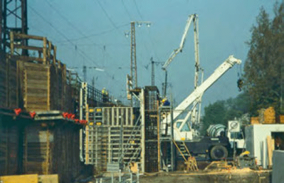 | Abb. 1-2: | Bei Mobilkran und Betonpumpe besteht hier die Gefahr der Annäherung an die auf den Fahrleitungsmasten geführte Speiseleitung. |