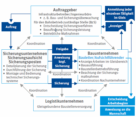 | Abb. 3-1: | Beteiligte Stellen und Zusammenarbeit der Verantwortlichen an einer Arbeitsstelle im Gleisbereich bei getrennter Vergabe von Bau- und Sicherungsleistung. |