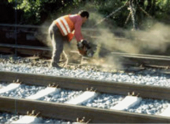 | Abb. 3-3: | Bei Schienentrennungen wurden Störschallpegel bis zu 114 dB(A) gemessen. Die erforderliche persönliche Schutzausrüstung muss getragen werden (für das Signalhören geeigneter Gehörschutz, Schutzbrille, Kopfschutz, die Warnweste ist geschlossen zu tragen). Für die hier gezeigte Arbeitsposition ist das Nachbargleis zu sperren. |