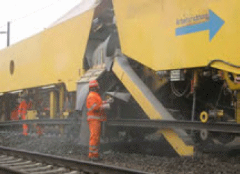 Gleisgebundene Großmaschinen, die sich kontinuierlich langsam fortbewegen (Bettungsreinigungsmaschinen, Planumsverbesserungsmaschinen, Gleisumbauzüge), haben planmäßige Arbeitsplätze außen neben der Maschine auch auf der Mittelkernseite. Verteilt über die Maschinenlänge treten mehrere Punkte mit Geräuschspitzen auf (z. B. Räumkette, Schotterauswurf, Schwellenaufnahme). Die Maschinen können mit maschineneigenen fest installierten Warnanlagen ausgestattet werden. Im Netz der DB ist dies verbindlich vorgeschrieben [33]. Bei der Arbeitsbreite ist der Arbeitsraum für den seitlich mitgehenden Maschinenbediener (Seitenläufer) zu berücksichtigen.