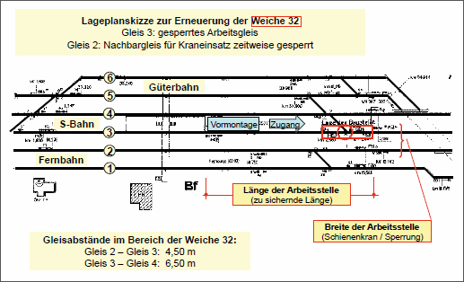Um die Sicherungsmaßnahmen eindeutig zu dokumentieren ist die Anfertigung einer Skizze sinnvoll, in der genaue Ortsangaben (Kilometrierung), Gleis- und Weichenbezeichnungen, Signale, Lf-Signale, Schutzhalt-Signale und der Zugang zur Arbeitsstelle eingetragen sind, vgl. Abb. 3-5. Damit lässt sich leicht ermitteln, ob alle erforderlichen Arbeitsbereiche, z. B. auch für Erdungsmaßnahmen, Schweißarbeiten, Vor- und Nachlauflängen sowie Transportwege für Schienenkrane oder Zweiwegebagger, in die Sicherung einbezogen sind.
