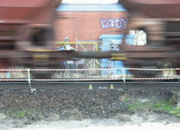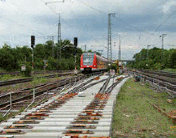 | Abb. 3-2: | Beim Transport vorgefertigter Weichenteile mit einem Schienenkran ist die gesamte Länge zwischen Montageplatz und Einbaustelle in die Sicherung einzubeziehen. |