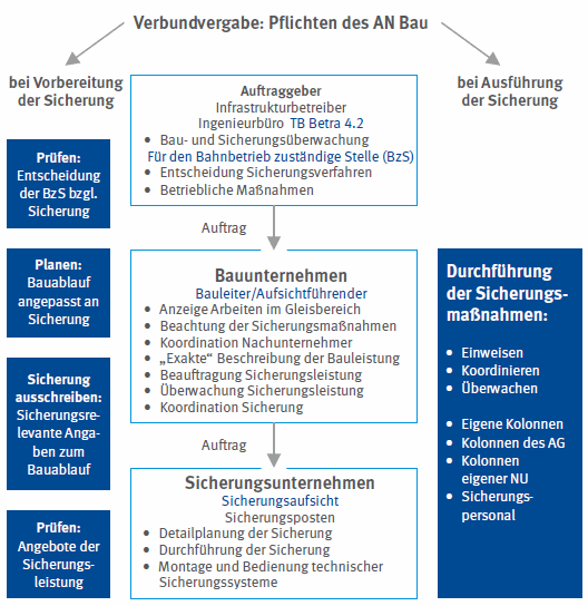 Die Verantwortung der BzS für die Festlegung des Sicherungsverfahrens, für die Durchführung der erforderlichen betrieblichen Maßnahmen (Gleissperrung, Einrichtung von Langsamfahrstellen, Ausschluss von Lademaßüberschreitungen, um z. B. eine FA zu ermöglichen), für die Sicherungsüberwachung und für die Sicherungskoordination gemäß [25] besteht auch bei gemeinsamer Vergabe von Bau- und Sicherungsleistung aufgrund der Verkehrssicherungspflicht des Infrastrukturbetreibers.