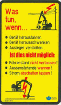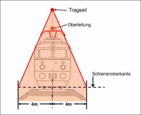 Besteht die Gefahr, dass der Schutzabstand zu unter Spannung stehenden Teilen der Fahrleitungsanlage nicht eingehalten werden kann, sind mit dem Anlagenverantwortlichen Sicherheitsmaßnahmen gegen mittelbare oder unmittelbare Annäherungen an oder Berührung von unter Spannung stehenden Teilen der Fahrleitungsanlagen festzulegen, z. B. Fahrleitung ausschalten oder abschranken ([14], [15] § 3 (2), § 12 (1)).