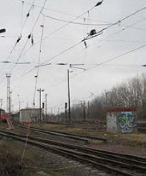 Von unter Spannung stehenden Teilen der Fahrleitungsanlage geht ein erhebliches Gefährdungspotenzial aus. Es muss stets angenommen werden, dass alle aktiven Teile unter Spannung stehen, solange sie nicht ausgeschaltet und sichtbar bahngeerdet bzw. mit dem Rückleiter verbunden (kurzgeschlossen) sind und die Arbeiten freigegeben sind. Zu den aktiven Teilen gehören bei den Oberleitungsanlagen neben Fahrdrähten/Oberleitungsstromschienen und Tragseilen u. a. auch Teile der Quertragwerke (Abb. 4-3), die Abspannungen (Abb. 4-1), die Rohrausleger und andere Teile der Oberleitungsstützpunkte, Speiseleitungen und andere an den Oberleitungsmasten mitgeführte Leitungen, Isolatoren sowie bei Gleichstrom-S-Bahn-Anlagen die Stromschienen. Die folgenden Ausführungen betreffen Arbeiten in der Nähe von Fahrleitungen, nicht die Arbeiten an Fahrleitungen.