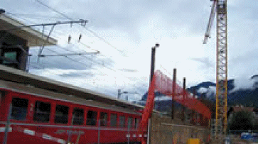 | Abb. 4-5: | Kranarbeiten bei ausgeschalteter Fahrleitung: Vor und hinter der Arbeitsstelle ist eine Bahnerdungsvorrichtung eingebaut. |