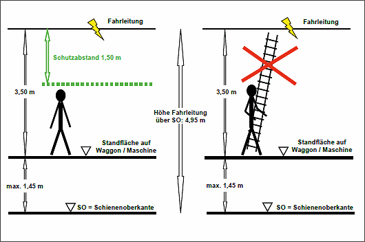 | Abb. 8-10: | Bei Aufenthalt auf Waggons oder Maschinen muss der Schutzabstand zur Oberleitung eingehalten werden. Bei einer Oberleitungshöhe von 4,95 m darf die Standhöhe über Schienenoberkante max. 1,45 m betragen. Arbeiten mit aufragenden Gegenständen sind nicht zulässig. |