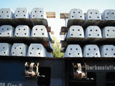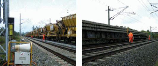 | Abb. 8-7: | Der für Materialwagen zu sichernde Bereich ragt am Baulosanfang und/oder Baulosende weit über das Ende des bearbeiteten Gleisabschnitts hinaus (links: Bunkerschüttgutwagen einer Planumsverbesserungsmaschine, rechts Schwellenwagen eines Umbauzuges). |