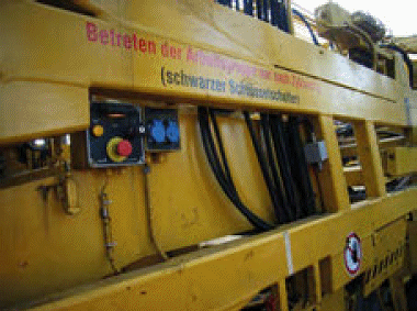 Die Arbeitseinrichtungen der Maschinen wie z. B. Räumketten für Schotter, Schwellenaufnahme- und Schwellenverlegeeinrichtungen, Förderbänder für Schwellen und Schotter dürfen nur in Betrieb genommen werden, wenn die gemäß Betriebsanleitung erforderlichen Schutzeinrichtungen vorhanden und funktionsfähig sind. Der Aufenthalt im durch diese Arbeitseinrichtungen gefährdeten Bereich ist während des Betriebs nicht zulässig. Dies muss auch gegenüber Beschäftigten Dritter (z. B. Beobachtung wegen Kabeln oder Kampfmitteln) durchgesetzt werden. Die Funktion der Not-Aus-Einrichtungen ist regelmäßig zu prüfen. Diese dürfen nicht als Betriebs- Stopp missbraucht werden.