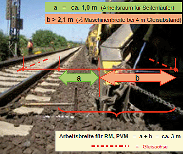Sowohl bei den Gleisumbauzügen (Bedienen der Schienenzangen auf ca. 50 bis 70 m Länge) als auch bei den Bettungsreinigungs- und Planumsverbesserungsmaschinen (Messarbeiten und Kontrollarbeiten im Bereich der Räumkette(n)) ergibt sich die erforderliche Arbeitsbreite zu ca. 3 m (gemessen ab Achse Arbeitsgleis in Richtung Nachbargleis, Abb. 8-4), um den Arbeitsraum für den Seitenläufer zu berücksichtigen.