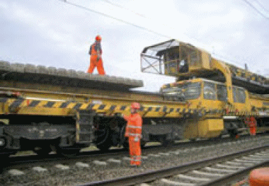 | Abb. 8-11: | Da die Schwellenwagen bestiegen werden müssen, um die Drahtverzurrung der Schwellen für den Umbauzug- Einsatz zu lösen, muss die Fahrleitung ausgeschaltet und bahngeerdet sein. |