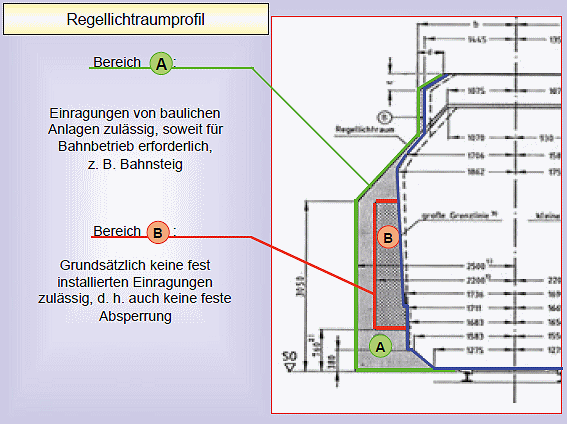Bereich A: Zulässig sind Einragungen von baulichen Anlagen, wenn es der Bahnbetrieb erfordert (z. B. Bahnsteige, Rampen, Rangiereinrichtungen, Signalanlagen), sowie Einragungen bei Bauarbeiten, wenn die erforderlichen Sicherheitsmaßnahmen getroffen sind.