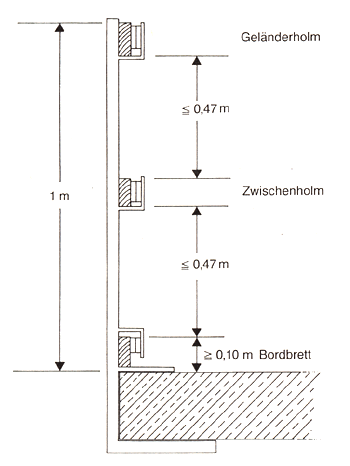 | 6.1.2 | Die Oberkante des Seitenschutzes muss mindestens 1 m über der Aufstellfläche liegen. Der Abstand zwischen Geländer- und Zwischenholm bzw. Zwischenholm und Bordbrett darf nicht größer als 0,47 m sein (siehe Bild 1). |