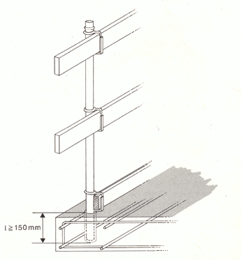 - Geländerholm und Zwischenholm aus Stahl- oder Aluminiumrohren mindestens der gleichen Abmessung bestehen und mit Normalkupplungen nach DIN EN 74 "Kupplungen, Zentrierbolzen und Fußplatten für Stahlrohr-Arbeitsgerüste und Traggerüste; Anforderungen, Prüfungen" angeschlossen sind,
