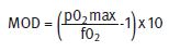 fO2 = Fraktion des Gases pO2 = Sauerstoffpartialdruck [bar] MOD = Maximale Einsatztiefe [m] Beispiel: MOD bei 140 kPa und einem Sauerstoffanteil im Gemisch von 30 % (fO2 = 0,3) (Nitrox–Gemisch 30/70) = 36,7 m Wassertiefe |